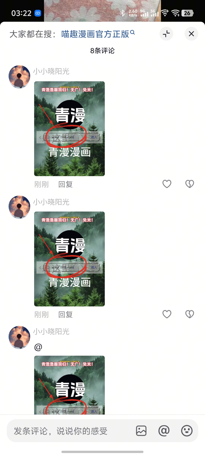 第二步:打开小红书,抖音,哔哩哔哩,快手 搜索;(喵趣漫画、免费漫画、漫画推荐、漫趣漫画、漫天星漫画、漫画解说、小说解说、看漫神器、漫画软件)有关的作品评论刚刚保存的图片并截图,要3条作品评论好截屏,如下图所示: